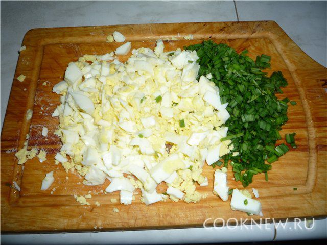 Порубить яйца и зеленый лук.