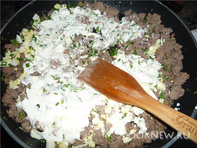 Добавить их у фаршу, сюда же добавить сметану.