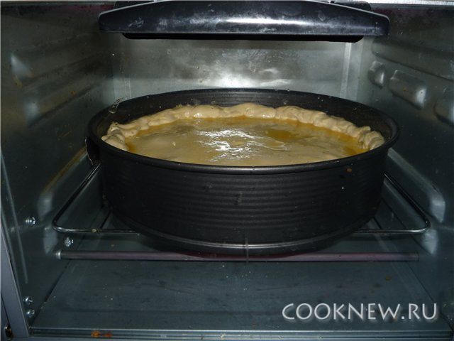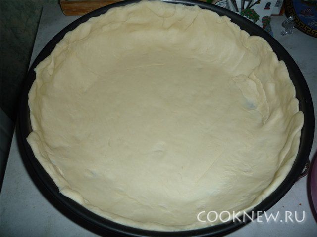 Тесто разделить на 2 части. Одну часть положить в форму, в которой будет запекать, создать бортики.