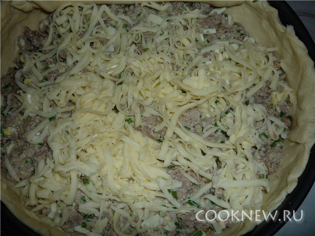 Выложить начинку. Посыпать тертым сыром.
