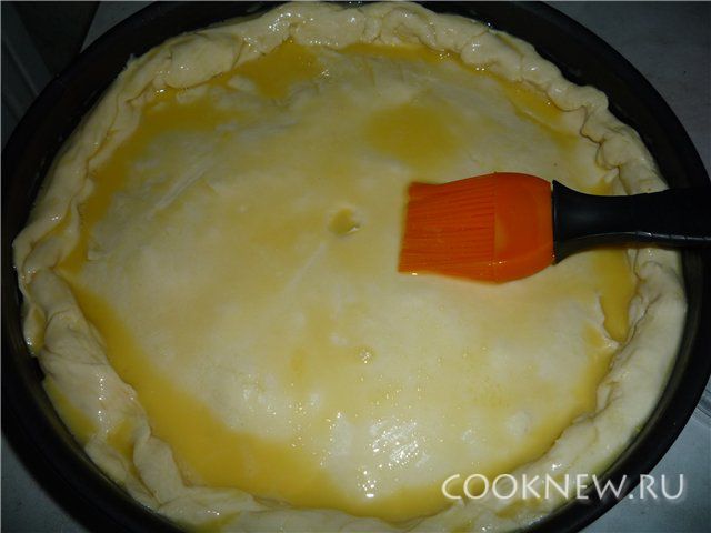 Накрыть пирог второй половиной теста и смазать яйцом.
