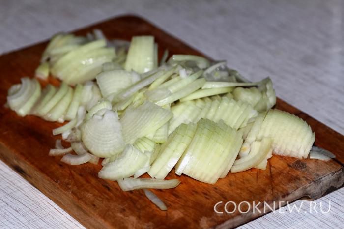 Лук порезать тонко полукольцами.