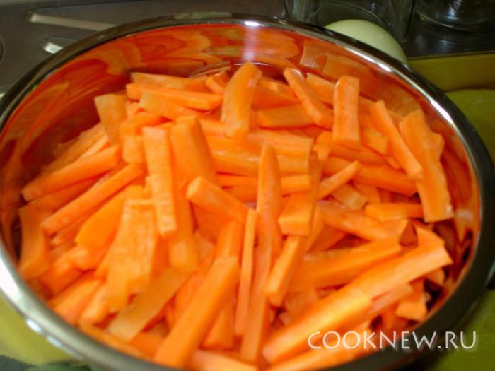 Морковь нарезать брусочками.