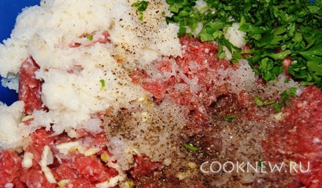 Фарш должен быть смешанный (половина телятины и свинины). К фаршу добавить натертый на терке лук, чеснок, замоченный в воде и отжатый хлеб, петрушку и орегано. Соль, перец по вкусу. Все перемешать и поставить минут на 30 в холодильник.