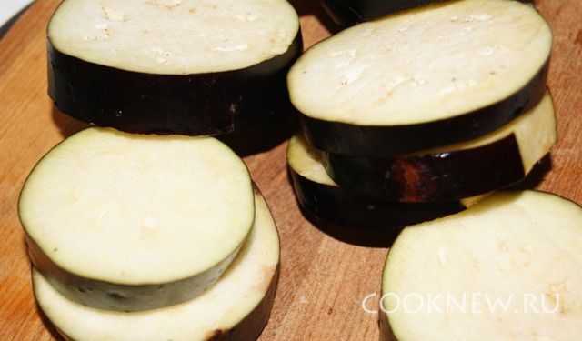 Баклажаны порезать кружками (1-1,5 см). Выложить в форму для запекания, смазанную небольшим количеством масла.