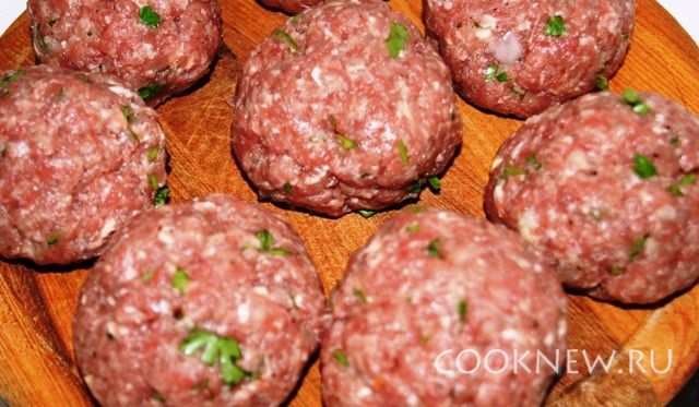 Из фарша сформировать 8 шариков, обвалять в муке.