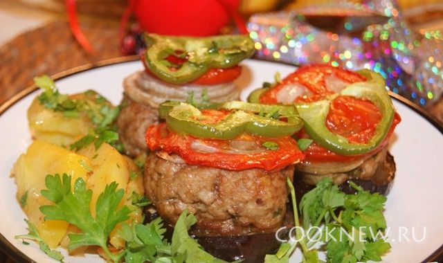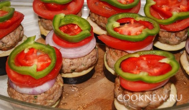 Красный лук, помидоры и перец порезать кружочками и выложить на фарш. Поставить в разогретую до 200 С духовку.