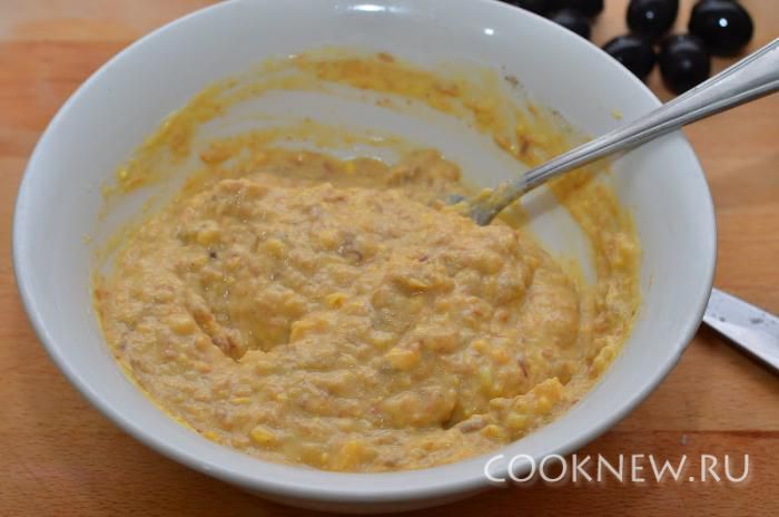 Добавляем консервированную рыбу. Хорошо перемешиваем. Солим по вкусу.