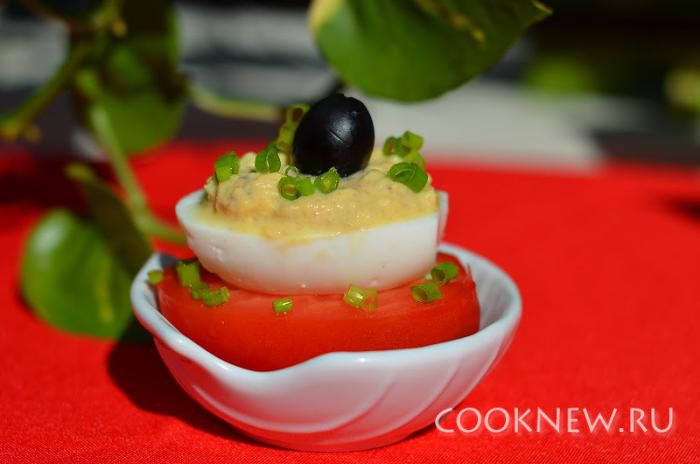 Помидор разрезать пополам, вырезать серединку. Вставить яйцо в помидор,посыпать зеленым луком. Сверху положить оливку.
