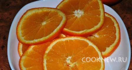 Апельсины порезать: один нарезать кружочками, второй - полукружочками.