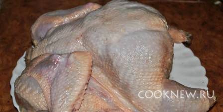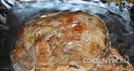 Курицу положить в рукав. Выпекать сначала при температуре 200 С 20-25 минут, затем выпекать час при температуре 180 С.