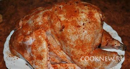 Чеснок пропустить через пресс и смазать им с солью курицу изнутри и только чесноком-под кожей.