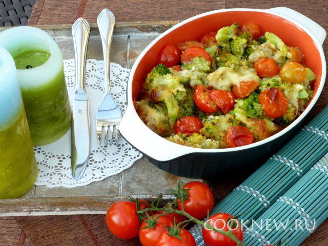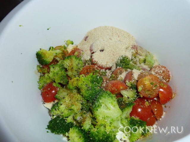 Перемешать масло, сухари, сыр, помидоры и брокколи. Посолить по вкусу.