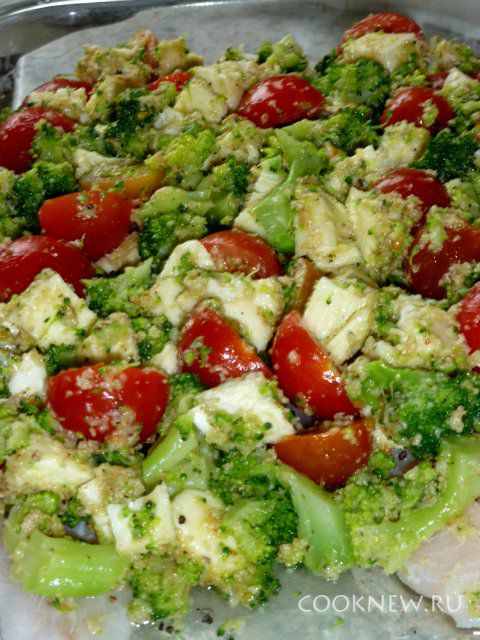 Выложить овощи сверху на рыбу.