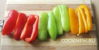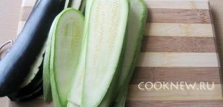 Кабачок и баклажан нарезаем пластинками и каждую пластинку режем еще пополам.