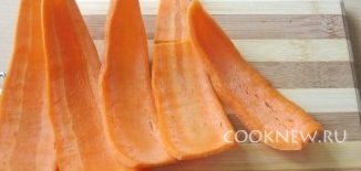 Небольшую морковку нарезать пластинами. Отварить ее ( 5-7 минут после закипания).