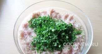Зелень (на Ваш выбор - лук, петрушка, укроп) рубим. Добавляем к фаршу.
