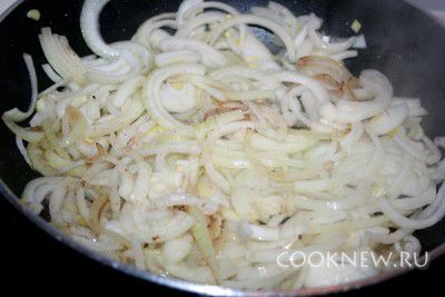 Лук почистить, нарезать полукольцами и обжарить на небольшом количестве масла.