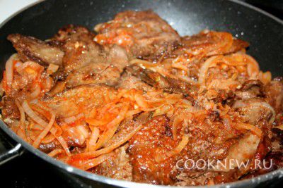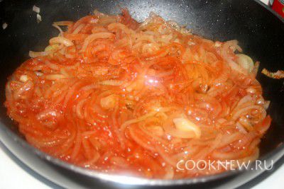 Добавить томатную пасту, перемешать и пока оставить.