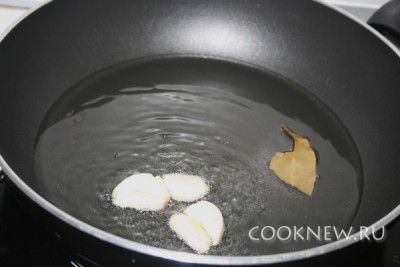 На сковородку налить масла, положить чеснок и лаврушку.