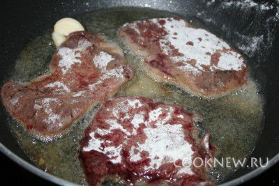 Печень порезать небольшими пластинками-отбивными. Обмакнуть с 2 сторон в муке и обжарить с каждой стороны минутку.