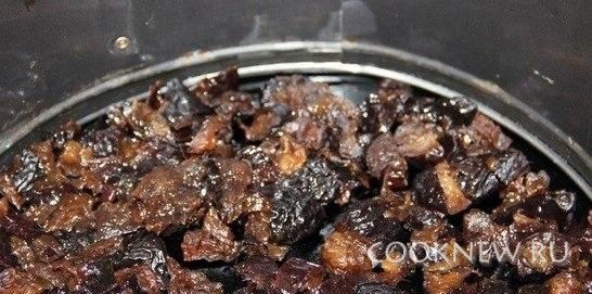 Отвариваем куриную грудку, яйца, картофель. Грибы обжариваем. Чернослив на 15 минут опускаем в кипяток. Затем режем его на кусочки и выкладываем на дно формы, в которой будем делать салат.