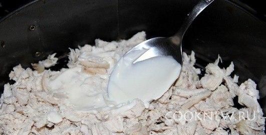 Режем куриную грудку и выкладываем на чернослив. Смазываем майонезом.