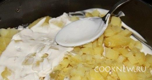 Картофель режем небольшими кубиками и выкладываем следующим слоем. Майонез.