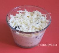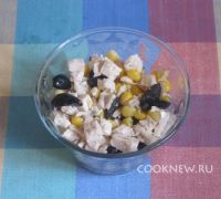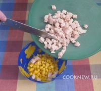 Куриное филе отварить. Порезать кубиками. В форму высыпать кукурузу, добавить мясо.