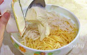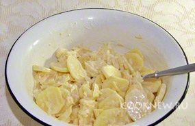 Картофель посолить по вкусу и выложить половину сырной смеси, перемешать.