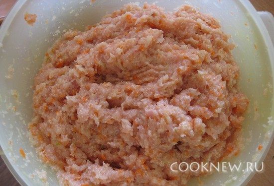 К фаршу добавить нашинкованную капусту, измельченные в мясорубке морковь и лук, добавляем манку. Посолить,поперчить по вкусу.