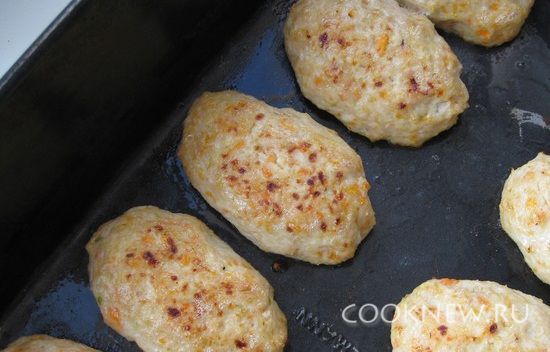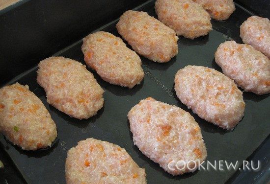 Мокрыми руками сформировать котлеты и выложить на противень, смазанный небольшим количеством растительного масла.