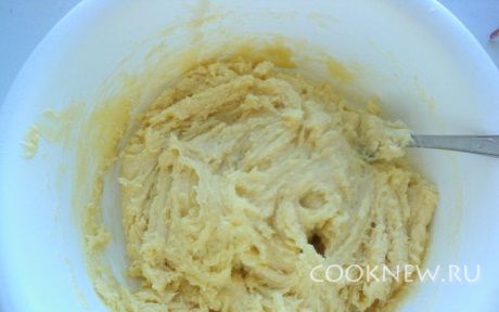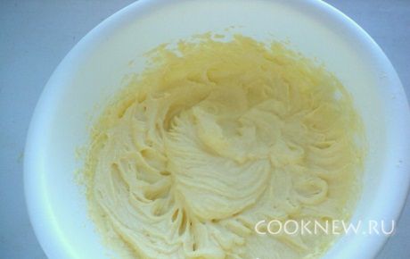 Масло комнатной температуры растереть с сахарной пудрой до белого цвета, добавить яйцо и еще раз растереть до кремообразного состояния.
