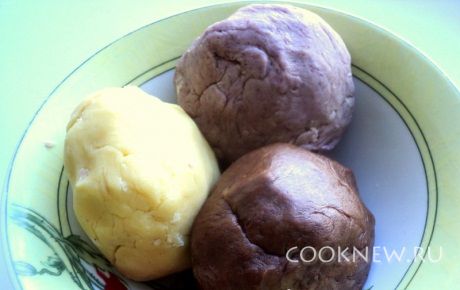 Разделить тесто на 3 части. В одну часть добавить какао и замесить шоколадное тесто, в другую - черничное пюре и 3 столовых ложки муки. Добавить к сиреневому тесто ванильный сахар. Тесто скатать в такие шарики и убрать в холодильник на 30 минут.
