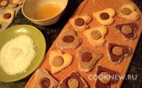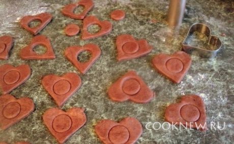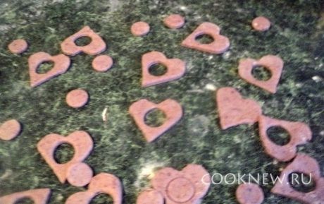 Тесто раскатать толщиной 5 мм, выемками сделать сердечки,а в них вырезать серединки.