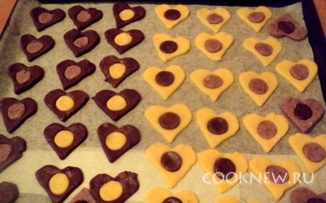 В каждое сердечко поместить кружки другого цвета. Выложить печенье на противень. Выпекать при 180 С 10 минут.