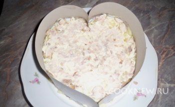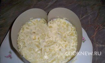 Картофель очень мелко порезать и выложить первым слоем. Смазать майонезом.