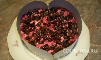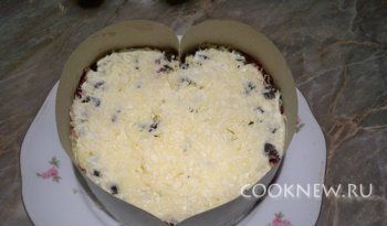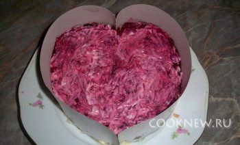 Свеклу потереть на крупной терке, половину выложить сверху, еще одну половину оставить на следующий слой. Смазать майонезом.