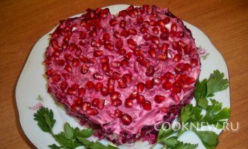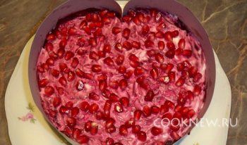 Выложить оставшуюся свеклу, смазать майонезом и сверху положить гранат.