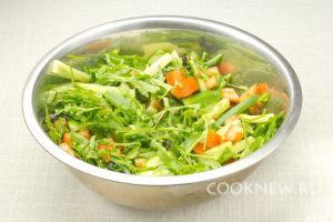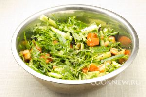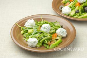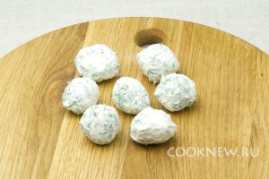 Салат разложить по тарелкам, сверху положить несколько сырных шариков.