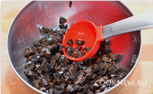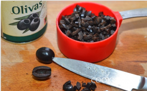 Порезать мелко оливки.