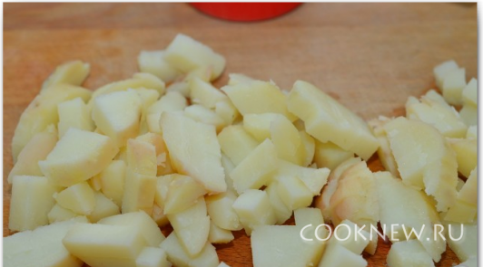 Вареный картофель очистить и порезать кубиками.