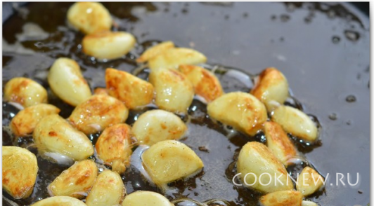 На половине сливочного масла обжарить чеснок до золотистого цвета.