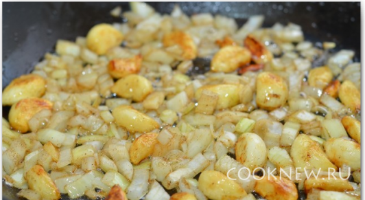Добавить картофель и оставшееся сливочное масло. Жарить еще 7-10 минут.