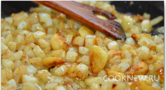 К чесноку добавить лук и обжарить еще 2 минуты.