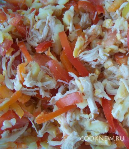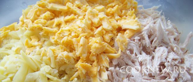 Куриную грудку и картофель отварить. Сыр натереть на терке. Остывшую куриную грудку разобрать на волокна, картофель некрупно порезать.
