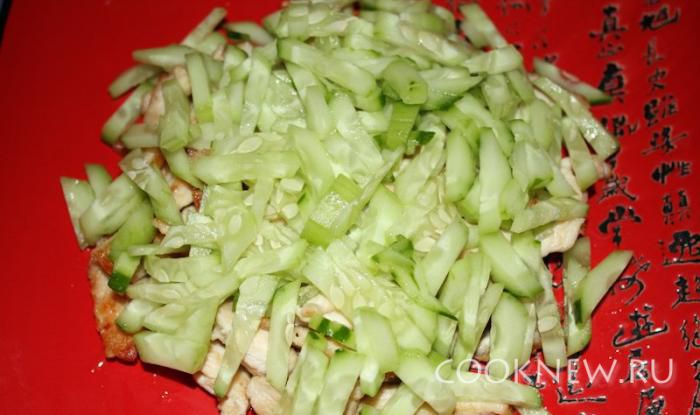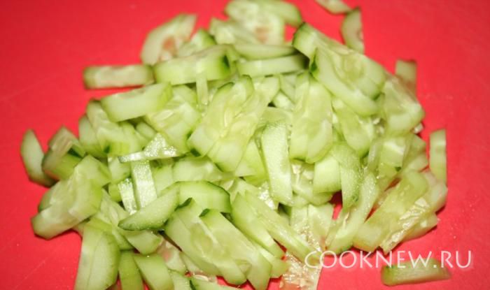 Огурцы порезать соломкой.
